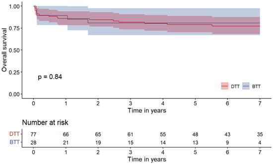 Data at the time of hospitalization for heart transplantation are depicted in Table 3. Aortic cross-clamp and cardiopulmonary bypass times were longer in the BTT group, without impact on in-hospital mortality between the two groups, BTT: one patient (3.6%) vs. DTT: four patients (5.2%) (p = 0.999).