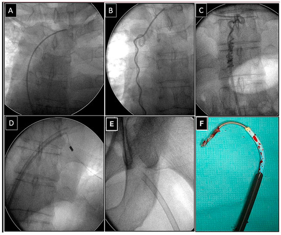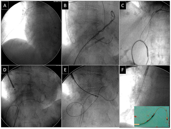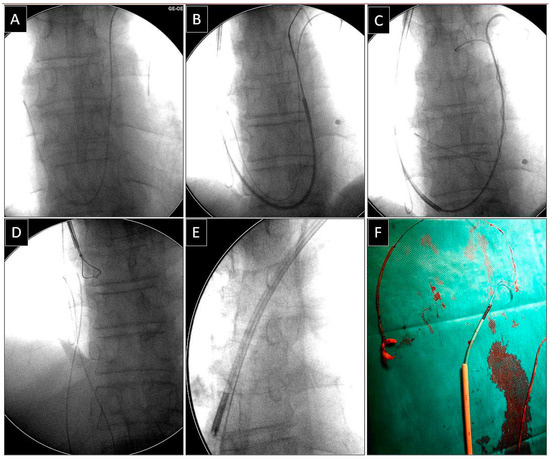 Removal of the fractured unipolar ventricular lead with its proximal end in the distal branch of the pulmonary artery, using a combined approach as well as the “spaghetti twisting technique” and a loop to release its proximal end. The fractured unipolar ventricular lead ends in the distal branch of the right pulmonary artery (A). Incomplete retraction of the proximal lead end from the pulmonary artery. Complicated procedure, visible backup subclavian and femoral access (the catheter for implantation of left ventricular leads acts as a femoral workstation (B). Effective removal of the lead from the pulmonary artery using a loop made of a lasso catheter and an angiographic guidewire (C,D). Grasping the proximal lead end through a lasso catheter (also controlled by the catheter for left ventricular leads) from the subclavian access (E). Conventional lead dissection using a polypropylene sheath from the subclavian approach (F).