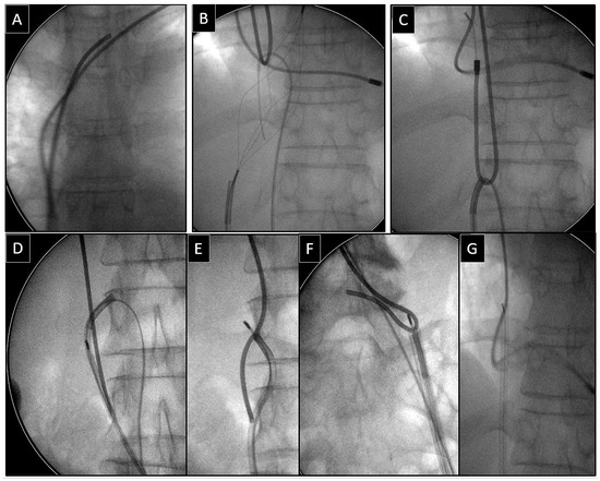 Removal of the fractured lead via the femoral access using a loop to free its proximal end. The end of the spontaneously fractured bipolar atrial lead in the anonymous vein (A). The loop was formed using a basket catheter controlled by a catheter for implantation of left ventricular leads and an angiographic guidewire (B). Pulling down the loop releases the proximal end of the lead and transfers it to the inferior vena cava (C,D). Grasping the proximal end of the lead with the basket catheter (E,F) and effective dissection of the lead using an extra-long polypropylene sheath (G).