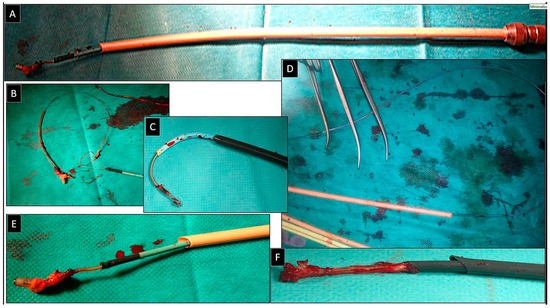 The most commonly used tools for the removal of spontaneously fractured leads with their proximal end in the cardiovascular space are lassos or basket catheters, guided by a catheter for implantation of left ventricular leads, or curved electrophysiological catheters. The fractured lead and a lasso catheter or a basket catheter act as its extension, and the sheath is an additional rail for a polypropylene or Teflon catheter. A classic set of instruments is used for the superior or femoral approach (A). The curved catheter for implanting left ventricular leads facilitates steering the lasso (B). Such a catheter allows the continuation of the procedure by dissection of the distal segment of the lead from the superior (jugular, subclavian) or femoral approach (C). Several surgical instruments prevent the slipping of the lead grasped by the lasso catheter (tools relieve the operator from controlling the closure of the lasso (D). Removed leads and tools used for dissection (E,F).