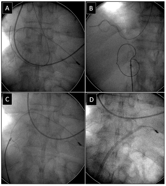 Depending on the position of the proximal end of the fractured and migrated lead, we tried to retrieve it with a lasso or a basket catheter using the femoral, less often jugular approach, or, if other leads were planned for extraction, we sometimes tried to use the subclavian access re-established after removal of the other lead [1,2,3] (Figure 1, Figure 2, Figure 3, Figure 4, Figure 5 and Figure 6). After firmly grasping the proximal end of the migrated lead, the lasso or basket catheter acted as an extension of the migrant lead, and we performed lead dissection until it was removed using polypropylene sheaths or 18F bevelled catheters acting as polypropylene conventional catheters [1,2,12,13] (Figure 1 and Figure 4). Mechanical rotational tools were rarely used in our patients as most (Figure 3 and Figure 4) of these procedures had been performed before the tools became available in the market. We rarely used the Eye of the Needle Snare©, Cook Medical Inc. Bloomington, IN, USA) other techniques proved more effective. When the proximal end of the fractured migrated lead could not be grasped, it was freed from the fibrous tissue by wrapping the lead around a pig-tail catheter (“spaghetti twisting technique”) [1,2,12,13] (Figure 1, Figure 3 and Figure 4) or equally frequently using a loop made of a guidewire and a lasso catheter or basket placed over the targeted lead and pulled [1,2,9,10,14,15] (Figure 2) if the “spaghetti twisting technique” was ineffective.