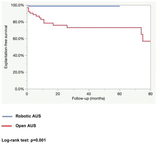 The present study has several limitations that should be considered when analyzing our findings. To begin with, the retrospective nature of the study brings many potential biases. The multicentric nature of the study brings heterogeneity: some centers only implanted via the open approach, while others switched more or less rapidly to the robotic one. Moreover, only the anterior robotic approach implantation was evaluated in this study, while several teams have described a posterior robotic approach technique which was not evaluated in the present report [,]. The causes of revision were not recorded in our dataset and could therefore not be presented, which may be regarded as a limitation. Also, our analysis of the short to medium term may underestimate the overall number of erosions and/or revisions in both groups. Regarding functional outcome, our evaluation is limited because we only evaluated complete continence subjectively, i.e., as self-reported by the patient. The multicentric and retrospective nature of the study did not allow us to collect robust data on patients’ reported outcomes using validated questionnaires. Finally, the main limitation might be the shorter median follow-up time for the robotic implantation population. This shorter duration may result in an underestimation of explantation and revision in the long run. Therefore, further studies with larger populations and extended follow-up periods would be valuable to confirm our findings and provide a clearer understanding of erosion and revision rates over time, especially for the robot-assisted implantation technique.