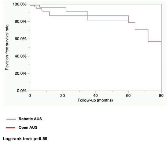 After a median follow-up of 12.2 months in the robotic group and 25.5 months in the open group, the rate of patients fully continent (i.e., 0 pad per day) was higher in the robotic group (83.3% vs. 62.3%; p = 0.01). The explantation rate as well as the revision rate were higher in the open AUS group (explantation rate: 27.4% vs. 1.4%; p < 0.0001, and revision rate: 17.5% vs. 5.6%; p = 0.02). (See Table 3). The estimated 1-year explantation-free survival rate was higher in the robotic group (98.6% vs. 78.3%; p = 0.001; Figure 1). The estimated 1-year revision-free survival was similar in both groups (86.6% vs. 96.2%; p = 0.59; Figure 2). All explantations were due to device infection or erosion. Specific causes for revision were not collected.