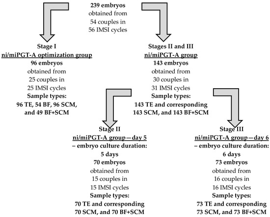 Samples obtained from embryo cultures conducted for 54 couples, who agreed to participate in the project, were examined in this study. All patients were of Caucasian origin, and their characteristics are shown in Table S1. All couples visited the private IVF center, Gyncentrum Sp. z o. o., based in Katowice, Poland, between January 2021 and July 2022, and all were qualified for infertility treatment with IVF using the IMSI (Intracytoplasmic Morphologically Selected Sperm Injection) procedure. During the study period, all couples underwent at least one IMSI cycle, and two couples participated in two cycles. All the couples had their embryos subjected to TE biopsy in order to perform conventional PGT-A, and the main reason for the testing was the advanced maternal age—35 out of 54 (64.8%) of women were 35 years old or older. The median age of the female partner was 36 years, the youngest woman was 26 years old, and the oldest was 43. Couples with severe male factor constituted about 20% (11/54) of the group, and the median age of the male partners was 37 years, with the youngest man being 28 years old and the oldest being 60. More than half of the group (51.9%, 28/54) were patients with previous unsuccessful IVF history. This category includes couples with up to 2 implantation failures, as well as those who have undergone IVF procedures but failed to obtain embryos suitable for transfer. In six couples (11.1%), one partner had an abnormal karyotype, which was the reason for the preimplantation genetic testing. In the studied group, there were 461 MII oocytes eligible for fertilization by IMSI procedure, and 276 viable embryos were obtained, of which 239 were subjected to TE-based PGT-A analyses along with non-invasive/minimally invasive PGT-A trial (with collection of SCM, BF, BF+SCM), collectively referred to here as ni/miPGT-A (Table S1). Not all obtained viable embryos were used in the study, as seven couples who agreed to participate in the study were not willing to biopsy all of their embryos. For these patients, the selection of embryos for the study was based on the degree of development of the blastocoel cavity and a clearly visible inner cell mass (ICM) to ensure the safety of the embryonic node. During the study, trophectoderm cells and corresponding non-invasive and minimally invasive culture materials from 239 embryos were collected in a three-stage procedure (Figure 1).