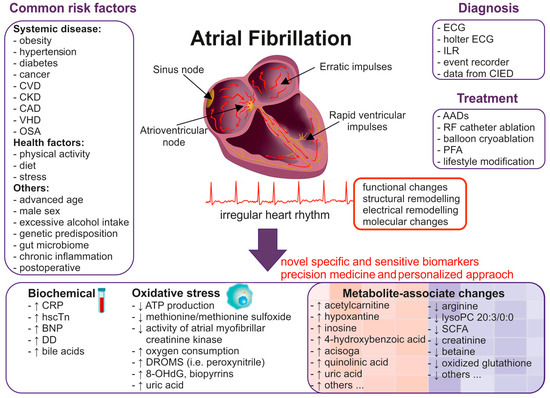 Atrial fibrillation overview. Various risk factors are presented, including metabolomic alterations, along with diagnostic and treatment methods. AADs—anti-arrhythmic drugs, ATP—adenosine triphosphate, CAD—coronary artery disease, CIED—cardiac implantable electronic device, CKD—chronic kidney disease, CRP—C-reactive protein, CVD—cardiovascular diseases, DD—D-dimer, DROMS—derivatives of reactive oxygen metabolites, ECG—electrocardiogram, hscTn—high-sensitivity cardiac troponin, ILR—implantable loop recorder, lysoPC—20:3lysophosphatidylcholine, OSA—obstructive sleep apnoea, PFA—pulse field ablation, 3RF—radiofrequency, SCFA—short-chain fatty acid, VHD—valvular heart disease, 8-OHdG—8-hydroxy-2′-deoxyguanosine.