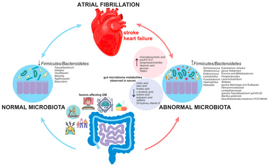GM, apart from the local impact on the gut, influences various human body systems which results in the establishment of gut–lung, gut–brain and also heart–gut axis concepts [204,205,206]. Accumulating data prove the GM causative role in the pathogenesis of various CVDs, including type 2 diabetes, hypertension, and atherosclerosis [206,207,208]. Furthermore, GM dysbiosis-induced CVD may cause atrial remodelling, and, subsequently, trigger AF occurrence [209,210]. Notably, patients with AF often have the same modifiable risk factors as ones for coronary artery disease, obesity, hypertension, and diabetes, all of which are substantially linked to dietary habits and therefore GM composition [210]. The diet can target the AF substrate itself and inhibit risk factors that encourage the development of the AF substrate [210]. Moreover, GM is involved in producing numerous key biological compounds, including SCFA, trimethylamine, carnitine, and indoxyl sulphate [201]. Also, GM enzymes take part in BA metabolism, producing both unconjugated and secondary BAs [201]. These compounds affect AF occurrence as described previously in the current review. Data indicate that some microbial metabolites, i.e., trimethylamine N-oxide, FAs, or lipopolysaccharides correlate with AF onset and/or prognosis [211]. Therefore, AF incidents are supposed to correlate with GM dysbiosis [109,209,211,212,213]; however, its extent and precise mechanisms remain unclear. Figure 2 presents bacterial alterations involved in GM dysbiosis in AF and its consequences.