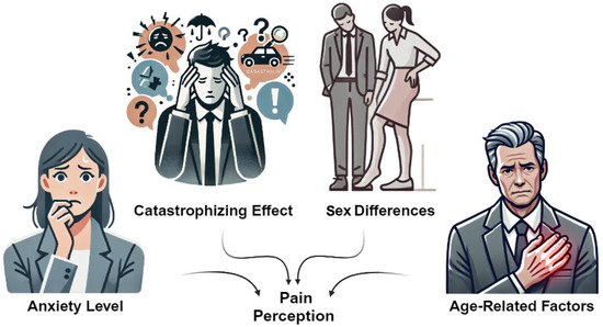 Pain perception is influenced by various factors, including the type of stimulus (such as heat versus pressure) and the specific neuroreceptors involved [13]. Clinical research shows that race contributes to variations in pain sensitivity, and aging leads to significant neurochemical and neuroanatomical changes that affect pain sensitivity, notably reducing responses to thermal and electric shock stimuli and correlating with fewer opioid receptors in the brain [14,15]. Notably, this diminished sensitivity tends to be more pronounced in women than in men. In clinical settings, older patients have been observed to perceive less severe and more delayed pain from myocardial ischemia compared to younger individuals [16]. However, the effect of sex on pain perception remains contentious, with research producing mixed results. This highlights the necessity of considering a range of factors including cultural, physiological, and psychological elements when evaluating pain responses [17].