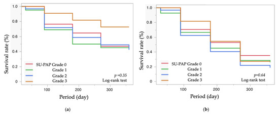 Survival analysis showed no significant differences in postoperative survival rates between the PAP groups (Figure 1). At 12 months postoperatively, the success rates for Grades 0, 1, 2, and 3 were 47%, 43%, 42%, and 73%, respectively, for definition A (Figure 1a), and 35%, 26%, 19%, and 27%, respectively, for definition B (Figure 1b). A post hoc power analysis for the log-rank test was performed based on the sample sizes (n = 17, 42, 32, 11), survival rates for each group (47%, 43%, 42%, and 73%), and a significance level (α) of 0.05. The resulting power was 88%, indicating a high likelihood of detecting true differences in survival rates among the SU-PAP groups.