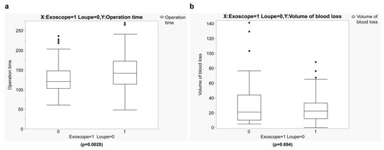 Surgical variables and outcomes are shown in Table 2 and Table 3. The exoscope group’s mean operative time (145.8 min) was significantly longer than that of the loupe group (128.5 min) (p = 0.0028) (Figure 1a). The mean amount of blood loss in the exoscope group (25.2 mL) was lower than that of the loupe group 29.3 mL); however, this difference was not significant (p = 0.694) (Figure 1b).