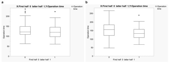 The loupe group showed no significant difference in operative time between the first and latter halves (Figure 2b). In contrast, the exoscope group showed a significant reduction in operative time between the first (mean: 156.5 min, SD: 48.3) and latter (mean: 137.1 min, SD: 37.6) halves (Figure 2a).