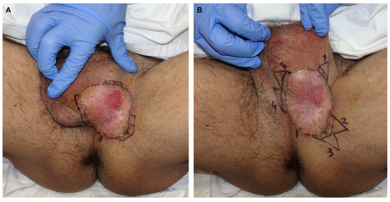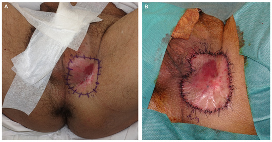 Extramammary Paget’s disease (EMPD) is an intraepithelial neoplasia that most frequently occurs in the anogenital region of older men and women. It is an apocrine adenocarcinoma that can spread epidermotropically for many years without invasive growth or metastasis. Due to various clinical presentations, diagnosis and treatment are often delayed. For a long time, wide local excision has been the preferred surgical treatment for EMPD, although it has recurrence rates of up to 60%, likely due to poor clinical margin definition and its multifocal nature with diffuse subclinical spread. Additionally, wide excision margins can result in large defects that cause anatomical deformity and morbidity. Mohs surgery is the treatment of choice, with a lower recurrence rate than conventional margin surgery [10,11,12,13]. However, since these lesions are often large, MMS can be time-consuming and logistically challenging, requiring well-trained surgeons, and is still associated with high recurrence rates. Non-surgical more conservative treatments for EMPD include topical imiquimod, 5-fluorouracil, radiotherapy, and photodynamic therapy [14].