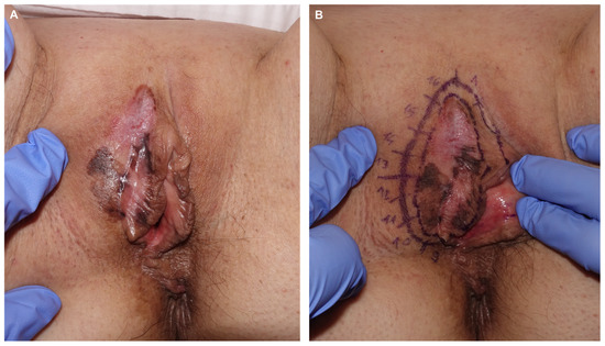 Some skin tumors can extend beyond their clinical appearance. This presents an additional challenge, especially when the affected area is the genital region, which is more difficult for both the patient and the physician to access and monitor due to its location and anatomical characteristics. Approximately 2% of all melanomas in women occur in the vulva. Unilateral labial involvement is the most frequent anatomic distribution of disease, although extension across the midline and/or clitoral involvement occurs in approximately 30% of patients [1]. In a series of 100 patients, the histological type in 64 was acral lentiginous [2]. Vulvar melanoma is characterized by a high rate of local recurrence and metastasis, and surgical intervention remains the standard treatment for localized lesions, but the ideal surgical approach and optimal margins are still unclear. While radical vulvectomy increases morbidity, it does not improve survival rates or reduce recurrence when compared to wide local excision [3]. Factors such as Breslow depth, ulceration status, and achieving clear margins are significant predictors of vulvar melanoma-specific survival [4]. The Mohs micrographic surgery (MMS) technique is appealing as it allows for stepwise confirmation of clear margins, potentially eliminating the need for radical excision or vulvectomy [5]. The lentiginous component of vulvar melanoma can be very subtle, with minimal pigmentation and poorly defined peripheral margins, often leading to an underestimation of its extent and an increased risk of incomplete resection. The same issue occurs with lentigo maligna on the head and neck, as well as with the lentiginous component of acral melanoma. Classically, for the treatment of lentigo maligna melanoma (LMM) and the lentiginous component of acral melanoma, a margin of at least 10 mm is recommended to ensure complete excision [6]. The vulvar region has aesthetic and functional considerations that may lead to a tendency to minimize resection—either consciously or unconsciously—thereby increasing the risk of insufficient margins. Consequently, recurrences are frequent unless precise lateral margin control is employed, often using MMS techniques [7,8]. Differentiating between a tumoral or dysplastic melanocyte and a normal melanocyte usually requires additional immunohistochemical studies beyond hematoxylin–eosin staining. Recent studies have validated rapid immunohistochemical techniques for melanoma and lentigo maligna in MMS with frozen sections, although these techniques require specific training and are generally not considered cost-effective [9]. Mohs surgery using paraffin sections takes days or weeks, during which time open, wounds in the genital region are at risk of infection and can have significant functional and psychological impacts.