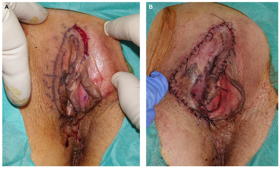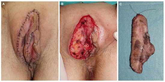 The “spaghetti technique” (ST) and its variants involve initially removing a small strip from all lateral margins of the lesion, which is then closed directly while awaiting the paraffin histological result [15]. The process can be extended with additional lateral excisions until all margins are clear. In the second stage, the tumor within those margins is removed, and immediate reconstruction is performed. We describe our experience with the resection of vulvar lentiginous melanoma and genital extramammary Paget’s disease using a method of deferred lateral margin control in surgical treatment.