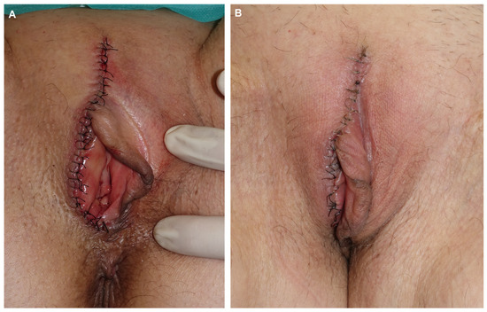 Final result after direct closure using 4/0 of 910 polyglactin braided suture and 5/0 silk (A). Appearance one week later before suture removal (B).