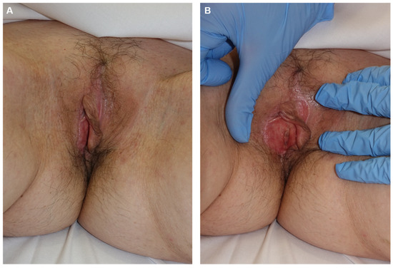 (A,B) Pigmented patchy lesion with whitish areas and minimally eroded sections, located on the external cutaneous border of the right labium majus.