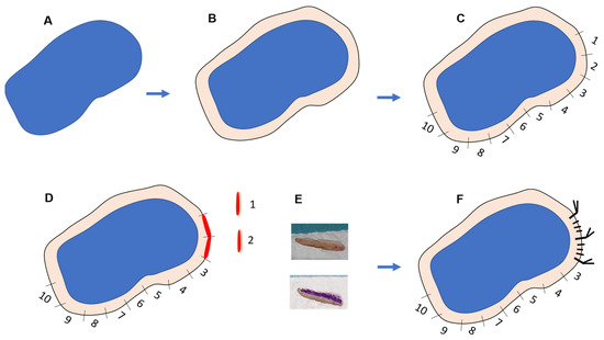 The tumor area is marked in blue using dermatoscopy and, if necessary, Wood’s light (A). A dermographic pencil outline is drawn around the tumor, extending a few millimeters beyond the clinical edge (B). The area is then divided into fragments measuring 1.5 to 2 cm and numbered for easier tracking (C). A scalpel is used to make incisions along the notches separating the fragments. Each piece is then cut into strips approximately 2 mm wide and 20 mm long (D). The strips are immersed in formalin for fixation, following the standard protocol. The image shows one marked piece and another unmarked (E). The defect left by the excised pieces is sutured directly. At the junctions between fragments, a silk stitch with longer ends can be left to facilitate identification later. Additional suture marks may also be placed between the pieces (F).