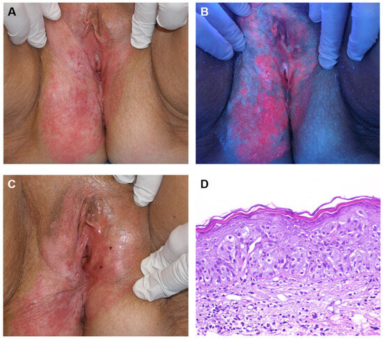 A 76-year-old woman with extramammary Paget’s disease primarily affecting the right vulva, with uncertain involvement of the left vulva (A). Photodynamic diagnosis: incubation with methylaminolevulinate cream for 2 h followed by illumination with Wood’s light. Coral red fluorescence is observed in both the right and left vulva (B). A black dot is marked to biopsy a clinically suspicious area with a positive photodynamic diagnosis (C). Histological confirmation of Paget’s disease in the left vulva (hematoxylin and eosin) (D).