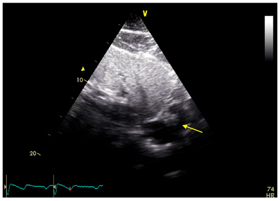 Transthoracic echocardiography in a subcostal view showing the CAT (yellow arrow).