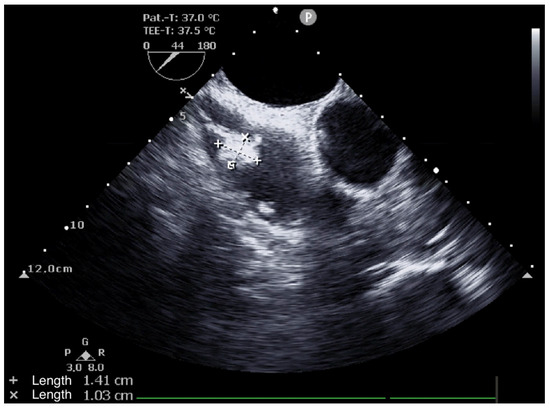 A 65-year-old woman (162 cm, 77.5 kg, BMI: 29.5 kg/m2) presented to an emergency department of a regional hospital with dyspnea, hemoptysis, vomiting and fatigue for four weeks. The patient’s past medical history included arterial hypertension, impaired kidney function and renal anemia with secondary hyperparathyroidism. Shortly after admission, the patient developed acute renal failure with anuria. A kidney biopsy showed a PR3-ANCA positivity, and GPA was diagnosed. After initiation of an immunosuppressive therapy with Cyclophosphamide (CyC) and corticosteroids, followed by a maintenance treatment with Rituximab (RTX) and prednisolone, the hemodialysis was initiated. One year later, the patient presented for evaluation for kidney transplantation, including a transthoracic echocardiography (TTE), transesophageal echocardiography (TEE), and a computed tomography, as well as an MRI (Figure 1, Figure 2, Figure 3 and Figure 4). TEE revealed an 8 × 5 mm sclerotic structure in the right atrium.