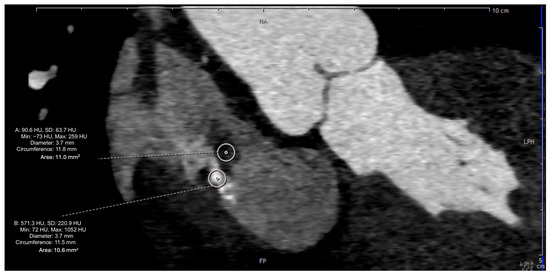 Cardiac CT image demonstrating tissue characterization using Hounsfield Units (HUs).