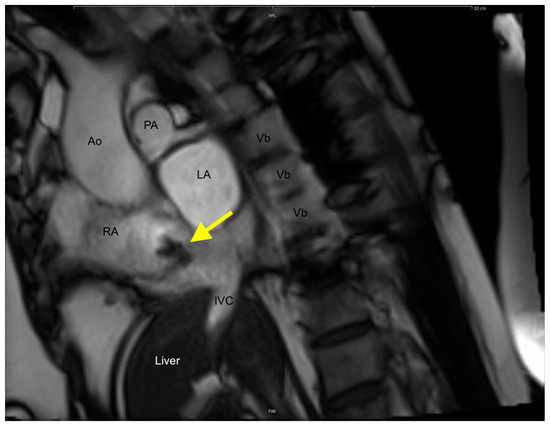 Cardiac MRI demonstrating the CAT in the right atrium (yellow arrow). (Ao, Aorta; IVC, Inferior Vena Cava; LA, Left atrium; PA, Pulmonary artery; RA, Right Atrium; Vb, Vertebra).