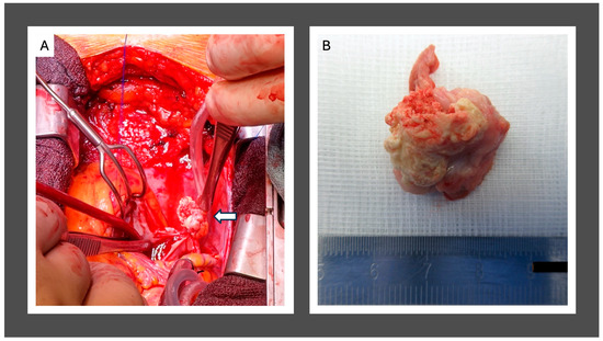 Intra-operative exposition of the CAT. Arrow indicates the tumor (A); in toto resection of the CAT, ex situs (B).