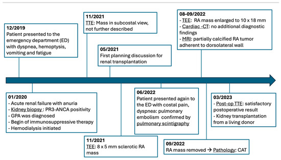 Detailed timeline of the patient’s diagnostic and therapeutic journey (CAT, calcified amorphous tumor; CT, computed tomography; GPA, glomerulonephritis with polyangiitis; MRI, Magnetic Resonance Imaging; PR3-ANCA, proteinase 3 antineutrophil cytoplasmic antibodies; RA, right atrium; TEE. transesophageal echocardiography; TTE, transthoracic echocardiography).