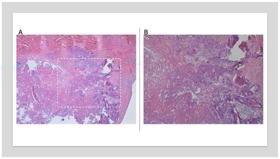 Microscopic examination (Figure 7 and Figure 8) of the excised tumor showed tumefactive dystrophic calcifications embedded within fibrous tissue and degenerated fibrin. Adjacent myocardial tissue revealed minor caliber variations of the cardiomyocytes without cellular atypia or evidence of inflammation or vasculitis. Findings were consistent with a benign pseudoneoplastic lesion (CAT).