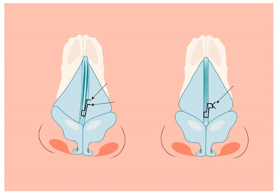Asymmetric osteotomies can also be considered. On the longer side of the nasal pyramid, an intermediate or an intermediate and lateral osteotomy can be performed, while on the shorter side, only a lateral osteotomy can be necessary. This technique allows for a measurable reduction in length and restoration of nasal symmetry [15,20].
