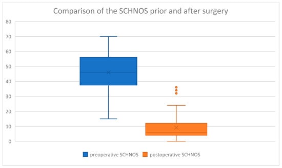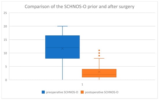 On the above-mentioned (Figure 6) visual increase in ROE score after surgery was observed in the examined group. Coterminously, rhinoplasty performed in our group of patients caused a decrease in SCHNOS (Figure 7), SCHNOS-O (Figure 8), and SCHNOS-C (Figure 9).