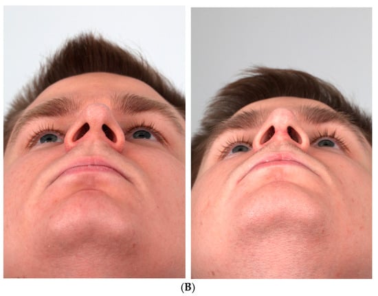 The basal view is crucial for assessing deviations of the septum in the caudal part, the position of the nasal tip nostril asymmetry (Figure 1D) [11,12,13].