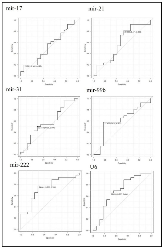 ROC curve analysis was performed to determine the best cut-off miRNA Ct values to detect GC. The cut-off values with maximum specificity and sensitivity were follows: mir-17, 27.7 (0.94, 0.19); mir-21, 22.8 (0.47, 0.80); mir-31, 33.5 (0.70, 0.50); mir-99b, 27.1 (0.82, 0.57); mir-222, 24.0 (0.70, 0.76); and U6, 29.8 (0.70,0. 65). AUCs with 95% CIs were also calculated: mir-17, 0.521 (0.33–0.70); mir-21, 0.584 (0.39–0.77); mir-31, 0.57 (0.39–0.761); mir-99b, 0.60 (0.42–0.78); mir-222, 0.73 (0.57–0.89); and U6, 0.68 (0.50–0.86). mir-222 was shown to be the most sensitive and specific miRNA to detect GC (Figure 3).
