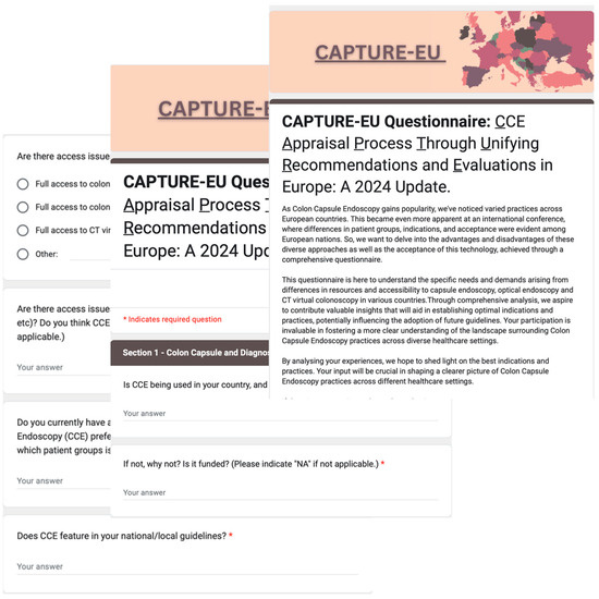 The CCE Appraisal Process Through Unifying Recommendations and Evaluations in Europe (CAPTURE EU) is a web-based survey using Google Forms (Google, Mountain View, CA, USA). This cloud-based tool allows for the creation, distribution, circulation, and analysis of the survey forms. Targeting capsule endoscopy specialists across Europe, the survey was available in English and accessible online at https://forms.gle/sgzigo4gUAfQyP4p9 (accessed on 10 January 2024). The survey was designed by the study’s steering group members, A.R. and I.L, with pilot testing performed by A.K., a seasoned CCE expert with over 5000 CCE reads. Feedback from the pilot test was received with subsequent incorporation into the final version of the survey. It consists of 20 items structured into six sections, as detailed in Table 1 and Figure 1.