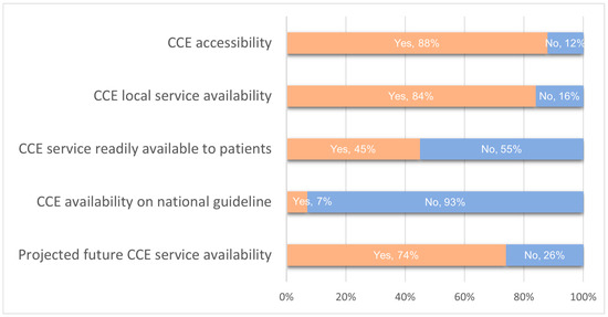 Accessibility to CCE was reported at 88%, with 84% having CCE services available (see Figure 2). However, only 45% had readily accessible local CCE services for patients. Moreover, just 7% reported having national guidelines that include CCE (Figure 3).