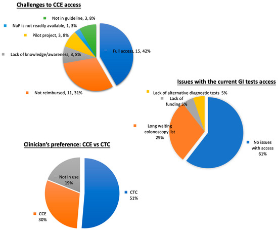 Charts of challenges to CCE access, issues with current GI test accessibility, and clinicians’ preferences between CCE and CTC.