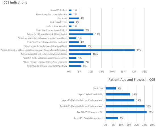 There are noteworthy variations in CCE practices across different countries, with each nation having distinct indications and target patient cohorts. For instance, based on the survey findings, France and Turkey exclusively use CCE for older and frail patients, while seven other countries prefer to limit its use to fit patients only. This pattern is further corroborated by a previous French multicentre study, which primarily employed CCE in elderly patients with a mean age of 70 years as part of routine clinical practice [16]. The top three CCE indications were patients who declined or did not tolerate colonoscopy (30%), IBD surveillance and monitoring (11%), and investigations for suspected IBD (10%).