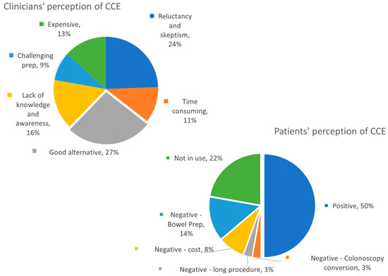 From the clinicians’ perspective, 27% of CCE specialists view CCE as a good alternative, while 24% perceive significant reluctance and scepticism. Other perceived issues included challenging bowel preparation, high cost, lack of knowledge and awareness, and significant time requirements for video analysis. For perceived patients’ perception of CCE, 50% viewed it positively, whereas 22% did not use CCE, and other negative perceptions included difficult bowel preparation, cost, long procedure, and the potential need for colonoscopy conversion (See Figure 6).