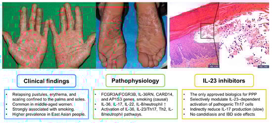 - Poortinga, S.; Balakirski, G.; Kromer, C.; Mössner, R.; Schön, M.P.; Bieber, T.; Wilsmann-Theis, D. The challenge of palmoplantar pustulosis therapy: Are Interleukin-23 inhibitors an option? J. Eur. Acad. Dermatol. Venereol. 2021, 35, e907–e911. [Google Scholar] [CrossRef] [PubMed]