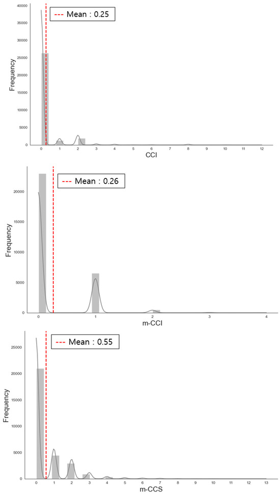 Distribution of CCI, m-CCI, and m-CCS comorbidity indices. CCI, the Charlson Comorbidity Index (CCI) currently used in Korea; m-CCI, a recalibrated version of the CCI developed specifically for this study; m-CCS, a modified comorbidity index constructed using the Clinical Classifications Software (CCS) from the Agency for Healthcare Research and Quality (AHRQ), Rockville, MD, USA.