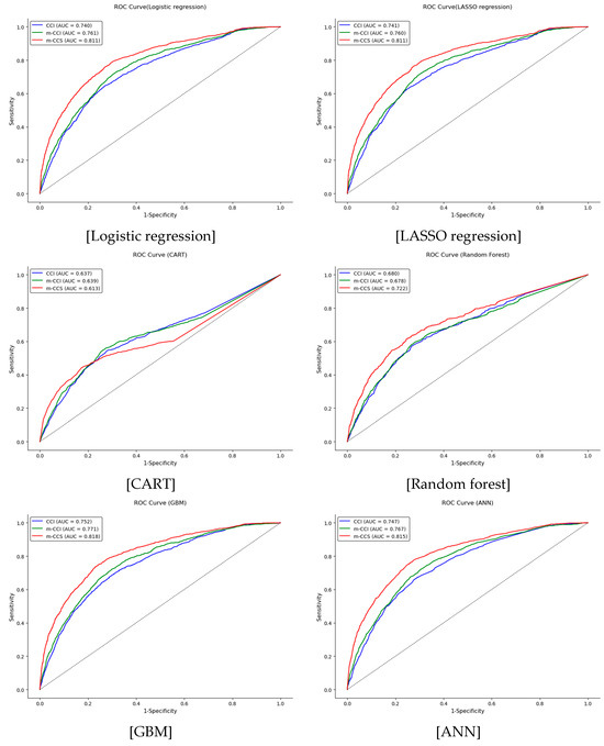 ROC curve. CCI, the Charlson Comorbidity Index (CCI) currently used in Korea; m-CCI, a recalibrated version of the CCI developed specifically for this study; m-CCS, a modified comorbidity index constructed using the Clinical Classifications Software (CCS) from the Agency for Healthcare Research and Quality (AHRQ), USA; AUC, area under the ROC curve; LASSO, Least Absolute Shrinkage and Selection Operator; CART, Classification and Regression Tree; GBM, Gradient Boosting Machine; ANN, Artificial Neural Network; ROC, receiver operating characteristic.