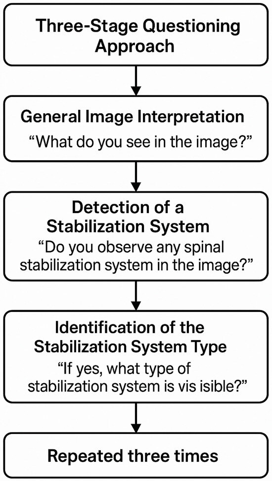 Flowchart illustrating the standardized three-stage questioning approach used to evaluate AI model performance. For each X-ray image, the model was asked: (1) to describe the image freely, (2) to determine the presence of spinal stabilization hardware, and (3) to identify the type of system if applicable. This sequence was repeated across three independent trials to assess consistency and diagnostic accuracy.