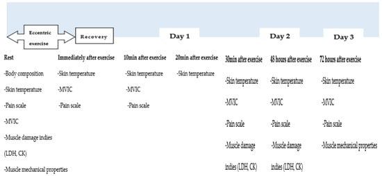During their initial laboratory visit, participants underwent anthropometric assessments. They were instructed to refrain from eating and exercising for at least 12 h before the assessment. The participants wore only sportswear during the assessments, which included measurements of height, weight, and body fat percentage. These measurements were obtained using an automatic height scale (SD-102, Biospace Co., Seoul, Korea) and a bioelectrical impedance analysis (BIA) machine (Inbody 720, Biospace Co., Seoul, Korea). All participants performed eccentric exercises followed by their assigned treatment. Prior to the eccentric exercise, the baseline assessments included measurements of body composition, pain scale, skin temperature, MVIC, and mechanical muscle properties. Blood samples were collected from the main vein of the forearm (10 mL). The same parameters, except for body composition, were evaluated immediately after the eccentric exercise. Ten minutes post-exercise, skin temperature, pain scale, and MVIC were assessed, and 0.5 mL of blood was drawn from the finger. Skin temperature was assessed again twenty minutes post-exercise. At the thirty-minute mark post-exercise, skin temperature, MVIC, and mechanical muscle properties were reassessed, and blood samples were collected from the main vein of the forearm (10 mL). Further assessments were conducted forty-eight and seventy-two hours after the muscle contraction exercise, including skin temperature, pain scale, MVIC, and mechanical muscle properties, with blood collected from the main vein of the forearm (10 mL). Nutritional factors that could influence the results were meticulously controlled throughout the experiment, with participants required to maintain a detailed meal diary. Additionally, participants were educated and closely monitored to ensure external factors such as alcohol consumption, exercise, sleep, and smoking did not impact the research outcomes.