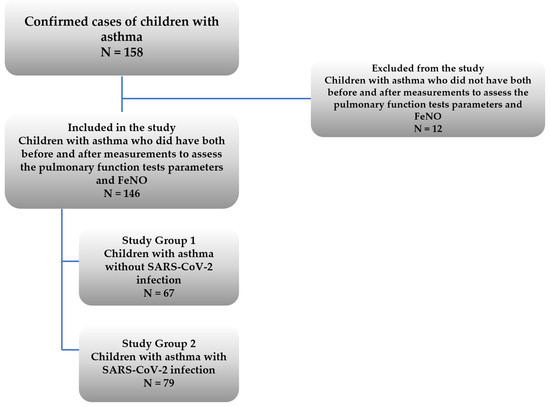 COVID-19 and non-COVID-19 evaluates the two pediatric patients with asthma included in the study group meaning patients who have contracted the infection (Study Group 2: with SARS-CoV-2 infection, N = 79) and those who did not contract the virus (Study Group 1: without infection, N = 67) (Figure 1).