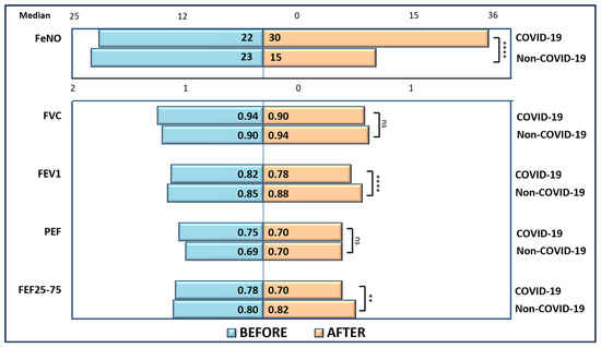 The retrospective analysis on the FeNO values and pulmonary function test parameters measured before SARS-CoV-2 infection indicated that the study group was homogenous with respect to the demographic data. According to a Mann–Whitney U test, there were no differences in FeNO and pulmonary function test parameters by gender or residence. Distributions of these parameters for children within those categories were similar, as assessed by visual inspection. Median FeNO and median pulmonary function test parameters were not statistically significantly different between girls and boys, or between children from urban and rural areas, p > 0.05 (Table 1).