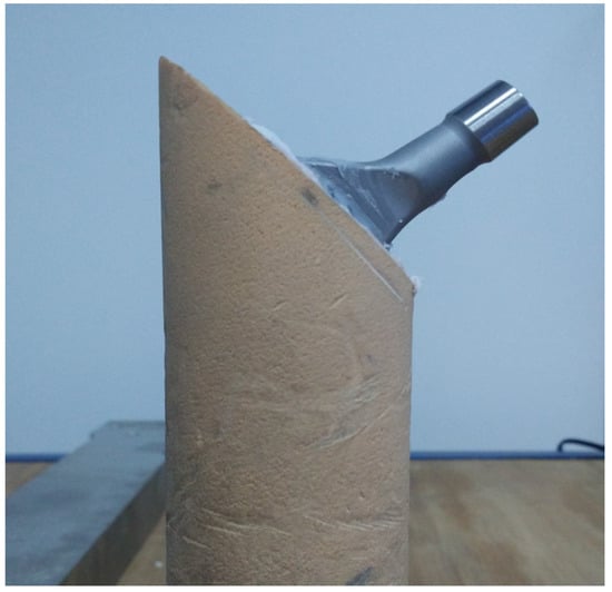 To minimize the variability inherent in cadaveric bone, PU foam was selected as a bone surrogate. The PU foam, with a density of 0.35 g/cm3 (ASTM grade 20 [25]), exhibits mechanical properties comparable to those of normal femoral and pelvic bone. Cylindrical specimens were fabricated with a diameter of 50 mm and a length of 200 mm. One end of each specimen was beveled at a 45° angle to simulate an osteotomy and a central intramedullary canal measuring 8.5 mm in diameter and 160 mm in depth was created to facilitate cement compression.