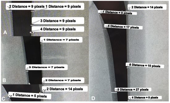 In the Classic (Line-to-Line) group, the cement mantle appeared symmetrical and uniform, averaging 9 pixels (~3.33 mm). This value falls within the clinically recommended range of 3–5 mm, supporting the technique’s suitability for consistent cement distribution (Figure 3A).