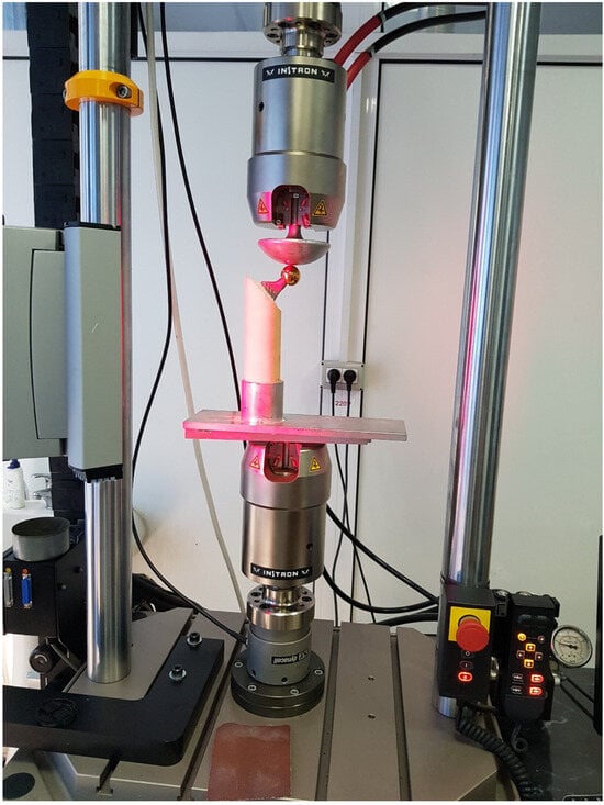 All tests were carried out under controlled laboratory conditions (22 ± 2 °C; 40–50% relative humidity) at a constant uniaxial displacement rate of 5 mm/min. Each test was continued until one of three endpoints was reached: either a total displacement of 20 mm, a peak load of 11,000 N, or a visible fracture of the construct.