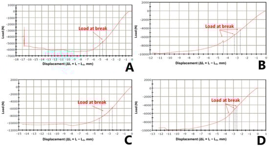 Load–displacement curves for the different cementation techniques: (A) Press-Fit (Undersized), (B) Classic (Line-to-Line), (C) Valgus Malpositioning, and (D) Overreaming (Oversized). The point of “Load at break” is marked for each curve, representing the ultimate load before failure.