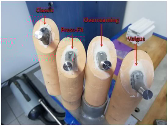 Following cementation, the final integration of the femoral stems within the PU bone surrogates is shown in Figure 2, illustrating differences in cement mantle thickness and implant alignment.