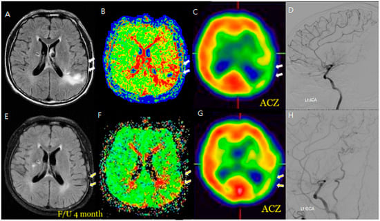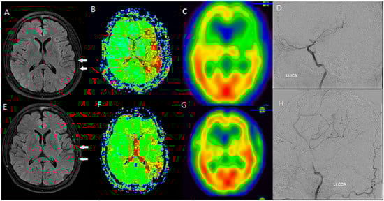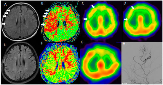 F/64 Moyamoya disease patients. Preoperative (A–D) and postoperative (E–H) MR FLAIR, perfusion MR, and SPECT show improved HV and CVR after STA-MCA bypass (white arrow: hyperintense vessels and decreased CVR in the same region). The areas showing hyperintense vessels on FLAIR (white arrows in (A)) correspond to zones of diminished CVR on SPECT (B–D). After STA-MCA bypass, the reduction in HV (E) is associated with improved perfusion, suggesting that the ivy sign reflects dynamic cerebrovascular status (F–H).